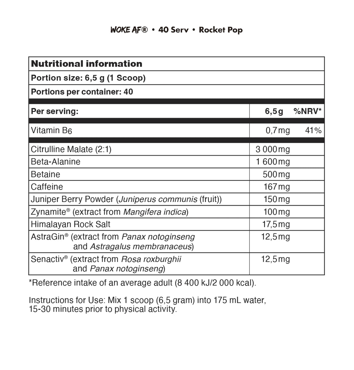 Woke AF is an ultra-high stimulant pre-workout designed for experienced athletes and those with a high tolerance to stimulants. With a powerful blend of energy-boosting and focus-enhancing ingredients, it pushes you beyond limits for peak performance.